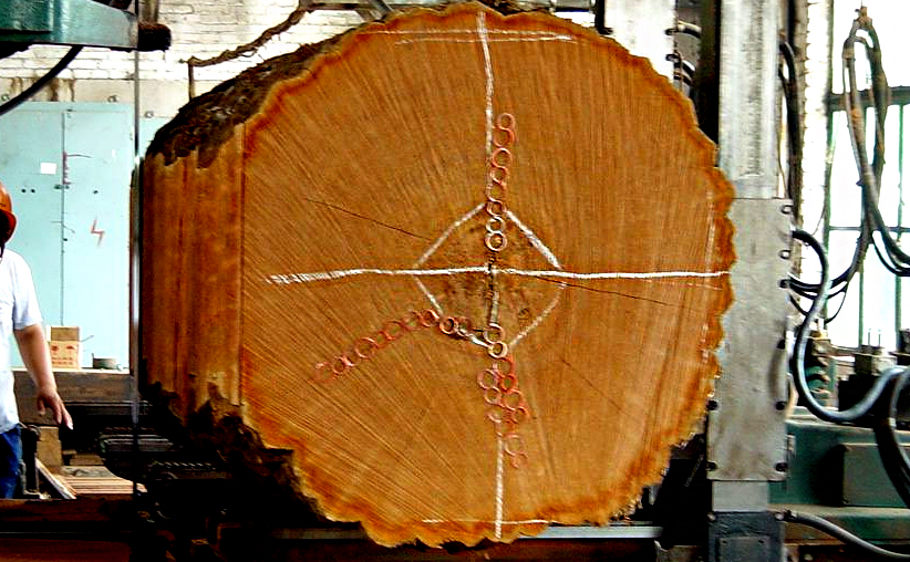 原木運(yùn)回工廠后,木工將原木用帶鋸鋸成厚薄不同的板材,可以長短搭配,綜合利用,減少浪費(fèi),節(jié)約紅木稀缺資源。